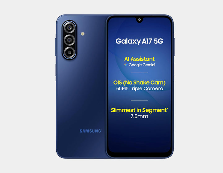 Immersive and vivid 6.7” Super AMOLED display - A wide and smooth 6.7-inch screen with Super AMOLED vibrancy and a 90Hz refresh rate means your world looks rich, bright, and immersive. Triple cameras to capture more details - The Galaxy A17 5G’s triple-camera array, with a 50 MP wide, 5 MP ultra-wide, and 2 MP macro lens, frames every scene with precision. Seamlessly shift from sweeping landscapes to close-ups in vibrant colour and clarity to capture life’s moments. Performance that powers your day - With its 2.4 GHz octa-core processor, the Galaxy A17 5G delivers smooth HD streaming, responsive gaming, and seamless social sharing. Stay current with 6x OS upgrades and security updates - Keep your device current and your info protected with 6x OS upgrades and 6 years of security support. Protection for the real world - Splash protection from IP54 and scratch defense from Corning Gorilla Glass Victus means you can focus on what matters. Ultra-fast 5G speed in your hands - Get the 5G advantage. Galaxy A17 5G delivers ultra-fast connectivity for streaming, gaming, and sharing on the go. Enjoy smooth video calls, fluid gameplay, and rapid downloads—trusted, high-speed 5G at work.